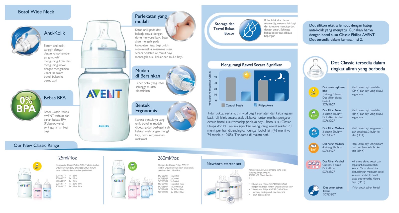 Wide Neck Bottle Philips Avent adalah yang botol susu generasi baru yang merupakan sahabat ibu menyusui. Mengapa? karena tipe botol susu Wide-Neck akan mengurangi resiko bingung puting. Penting untuk ibu bekerja yang menyusui untuk terhindar dari ‘ bingung puting’, untuk itulah pilih dot yang serupa dengan puting ibu.